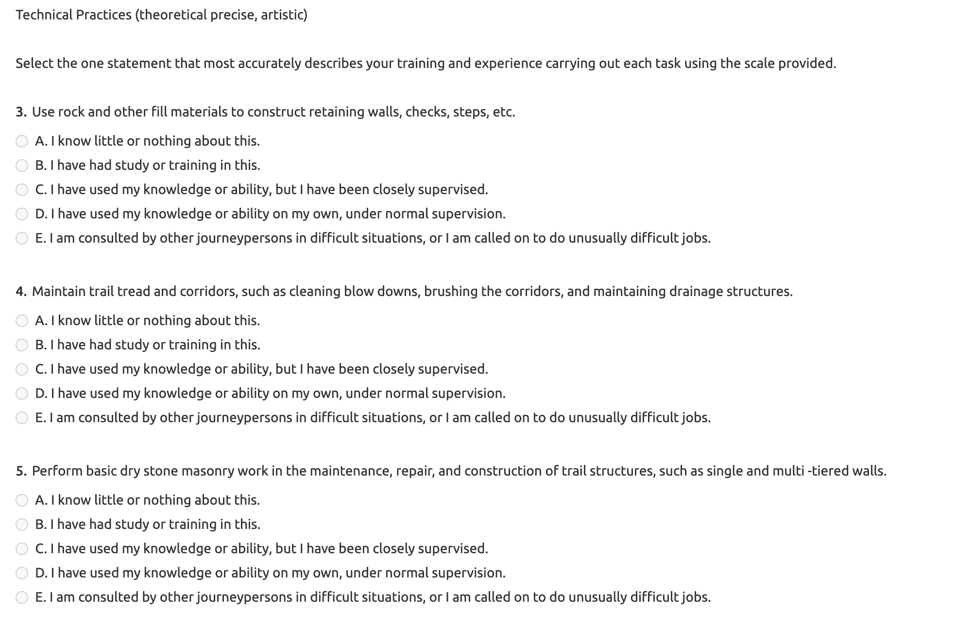 Learn the right keywords. Many job titles do not intuitively describe the job itself. The National Park Service lists many trails jobs as “Laborer”, “Maintenance Worker” or “Motor Vehicle Operator.” They may or may not include “Trails” in the title (i.e, “Maintenance Worker (Trails).” Don’t ignore job listings that don’t include “Trails” or “ Trail Worker” in the title. Take a moment to read the description and see if it includes trail work.
