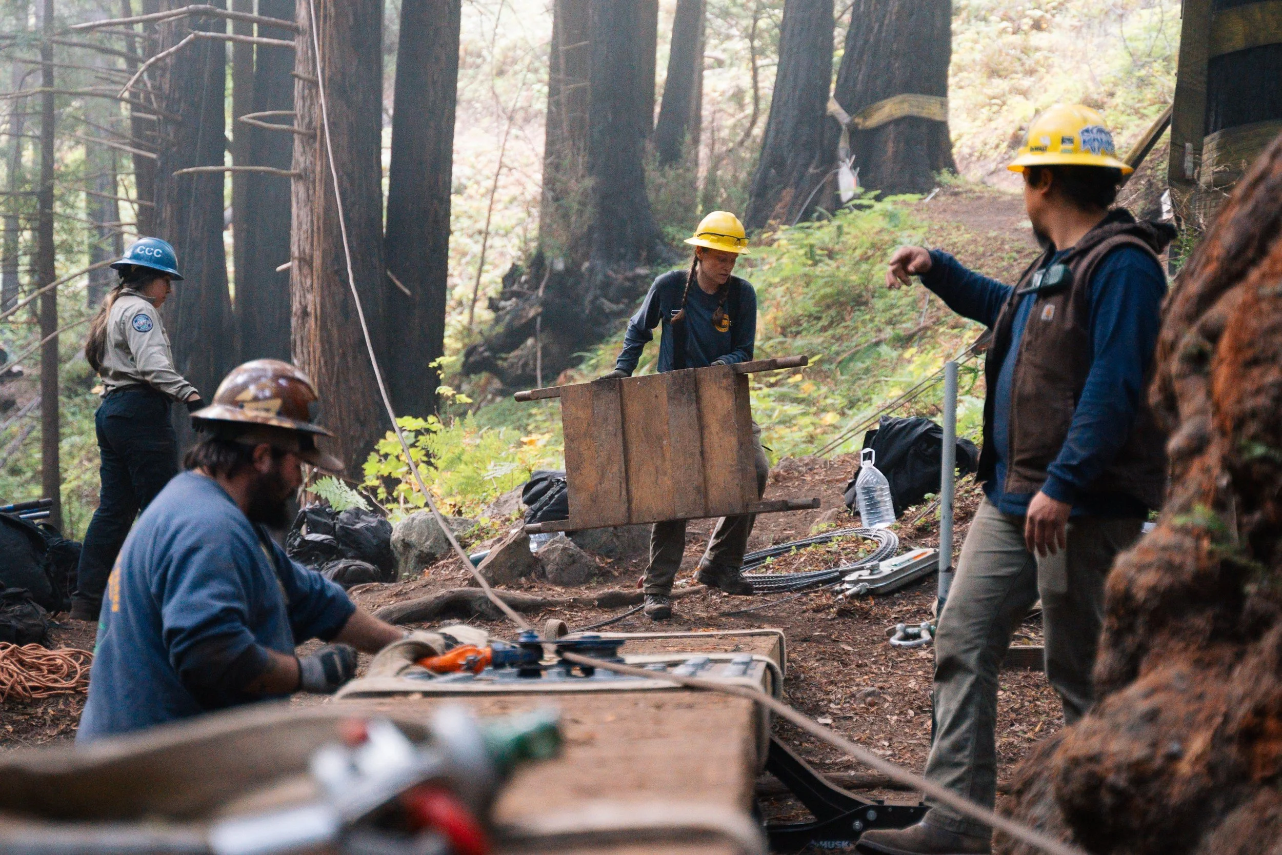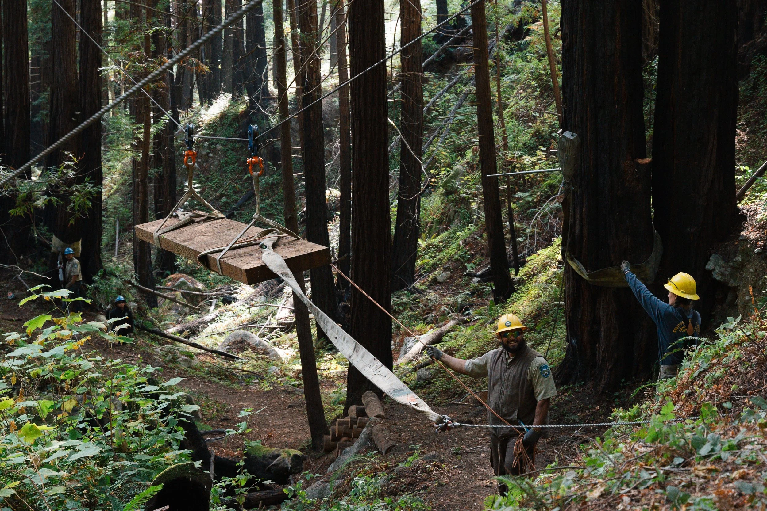A crew of seven folks from California State Parks led by Riley Dunn provided technical guidance to a crew of 12 California Conservation Corps members led by Paul Lugo. Riley is a friend and former colleague of mine, as well as a former contributor to Trail Crew Stories. For my part, I tried to stay out of my way while Riley directed the highline operation as a conductor does an orchestra.