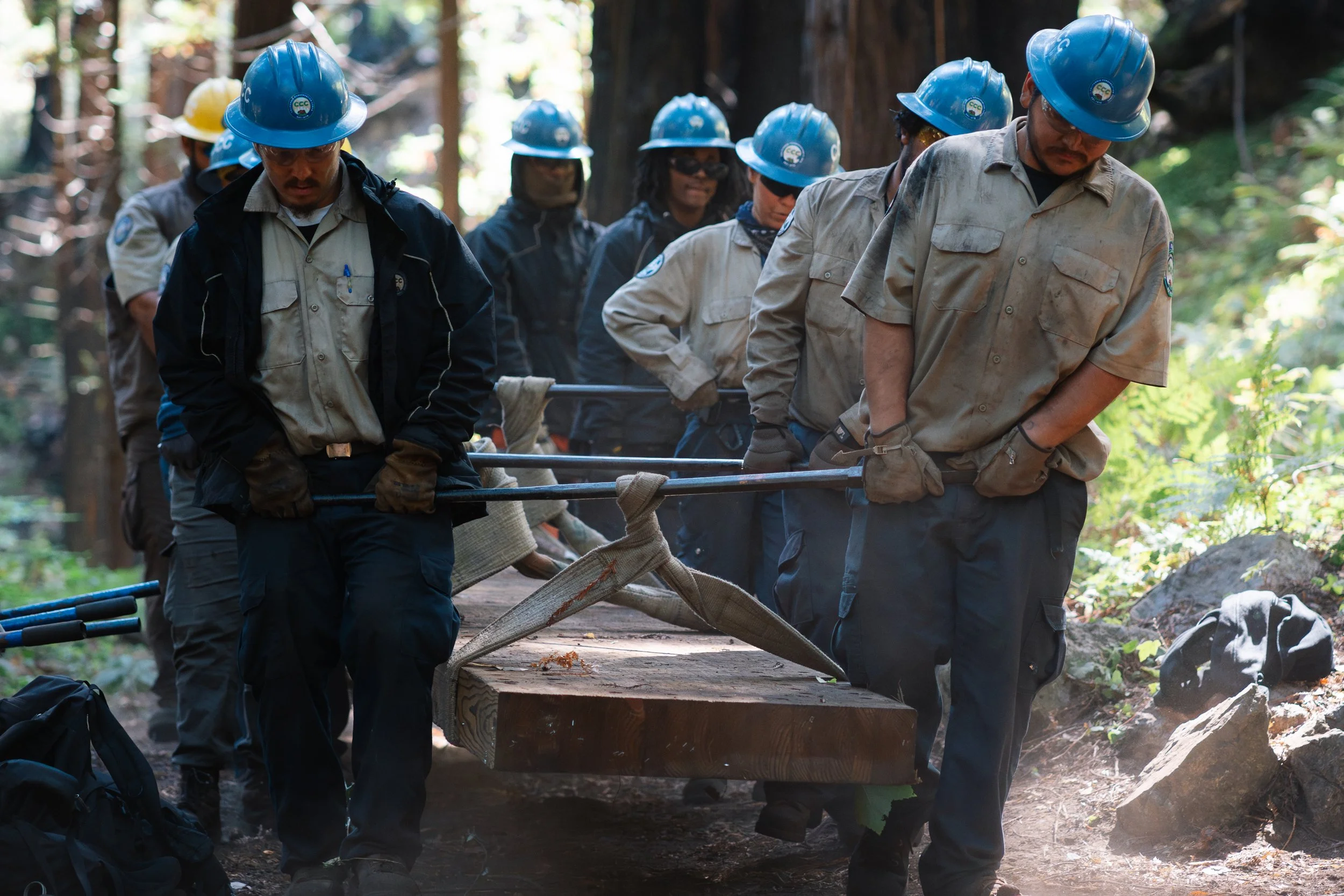 CCC Corps Members from the Inland Empire Center team carry a bridge stringer. Each stringer piece weighed about 1,000 lbs.