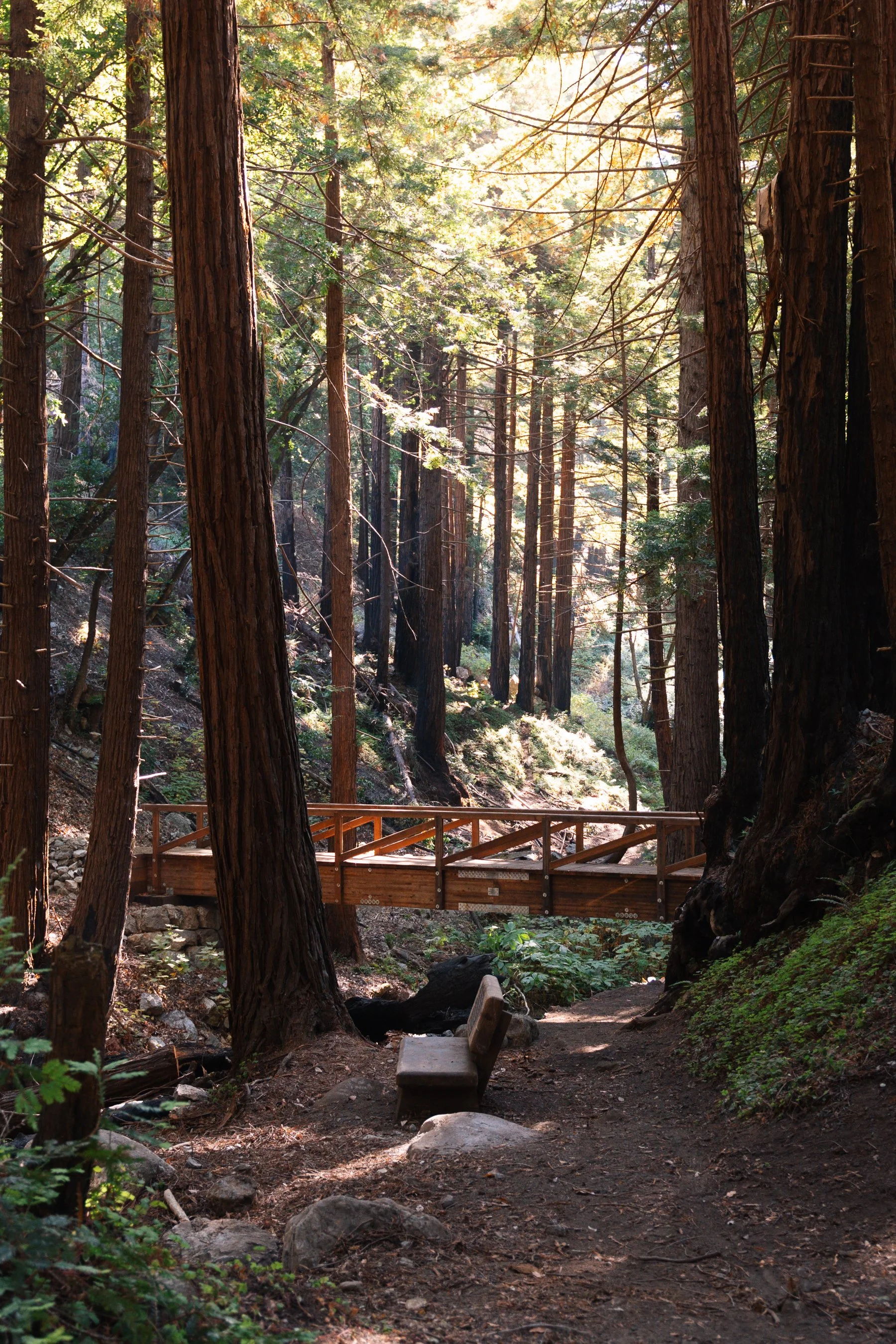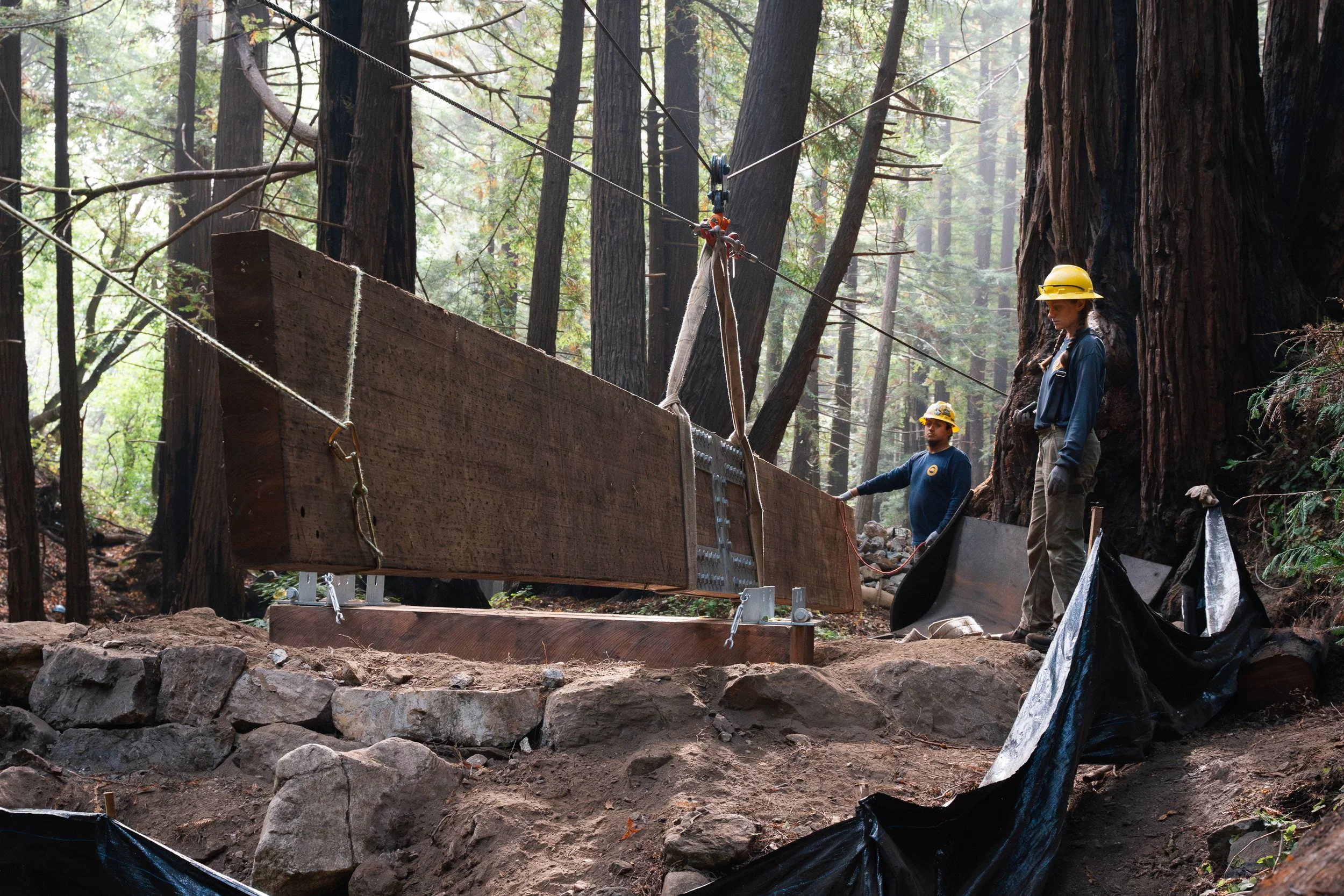 Wildfire, heavy precipitation, and high winds have taken a toll on the park, as in many areas of Big Sur. A fire-damaged tree smashed one bridge in 2020, and another tree smashed a different bridge during an intense storm in 2023. The crew finished replacing the first bridge in 2024 after road closures elsewhere in Big Sur delayed access to the park. During my two-day visit in October 2024, the crew was moving bridge components into position to replace the one that had been destroyed in 2023.