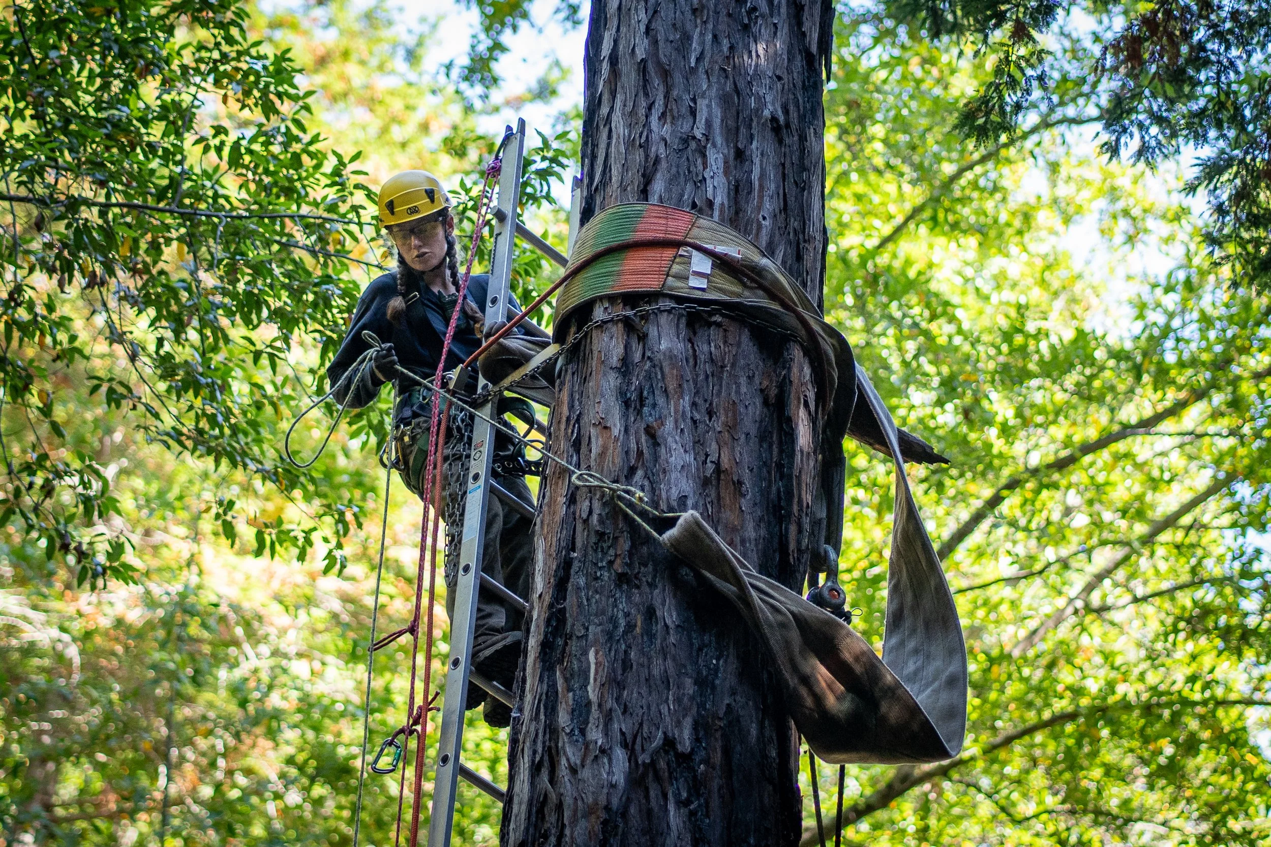 State Parks Crew Lead Riley Dunn scales a tree with a swedish ladder to set up a highline anchor.