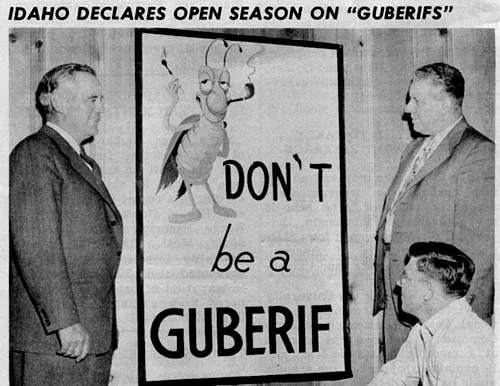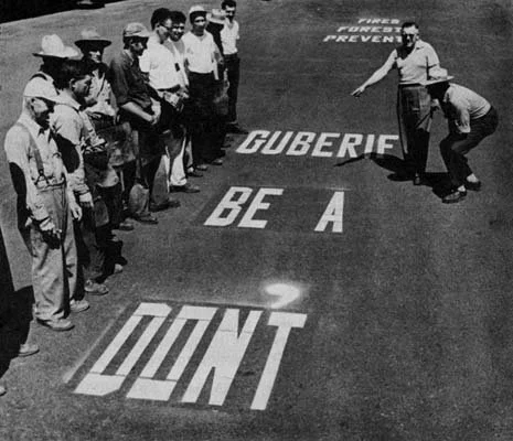 Guberif was the creation of the state of Idaho for a “Keep Green” campaign, which aimed to educate the public on wildfire prevention. The Guberif (conspicuously “firebug,” written backwards) is a droopy-eyed pest who wreaks havoc on western forests by causing wildfires, often from a lit cigarette. In 1951, the words “Don’t Be a Guberif” was painted 300 times across highways in Idaho, but only a handful of these original signs remain.