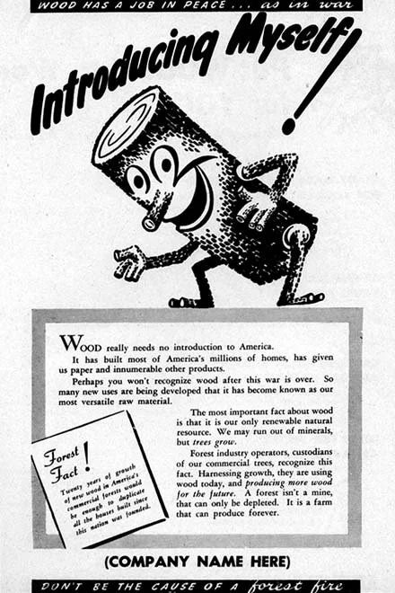 Woody’s introduction to the American public in 1944. Note how specific forestry companies could license the ad and insert their business name.