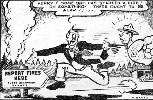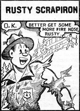 Rusty Scrapiron is a fictional park ranger and fire warden who was created as part of Oregon’s “Keep Green” campaign by cartoonist Hugh Hayes. Rusty appeared in a namesake comic strip from 1950-1952 as a Popeye-esque character who fought wildfires, chased down careless smokers, and even walloped forest visitors who started fires.