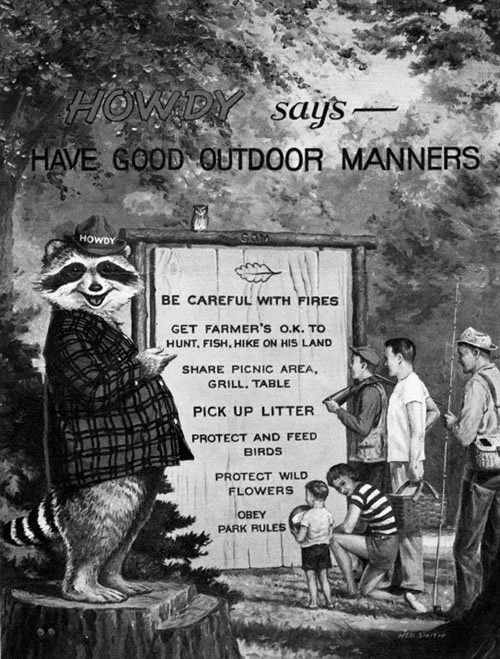Howdy the Good Outdoor Manners Raccoon was created in 1959 as the mascot for an anti-littering campaign by the Pennsylvania Forestry Association. Although Howdy’s popularity fizzled in Pennsylvania, his image was adopted on the West Coast by the Good Outdoor Manners Association (GOMA), an anti-litter advocacy group. GOMA gave him a boost through the 1960s, but Howdy had begun to say goodbye to the public by the late 1970s.