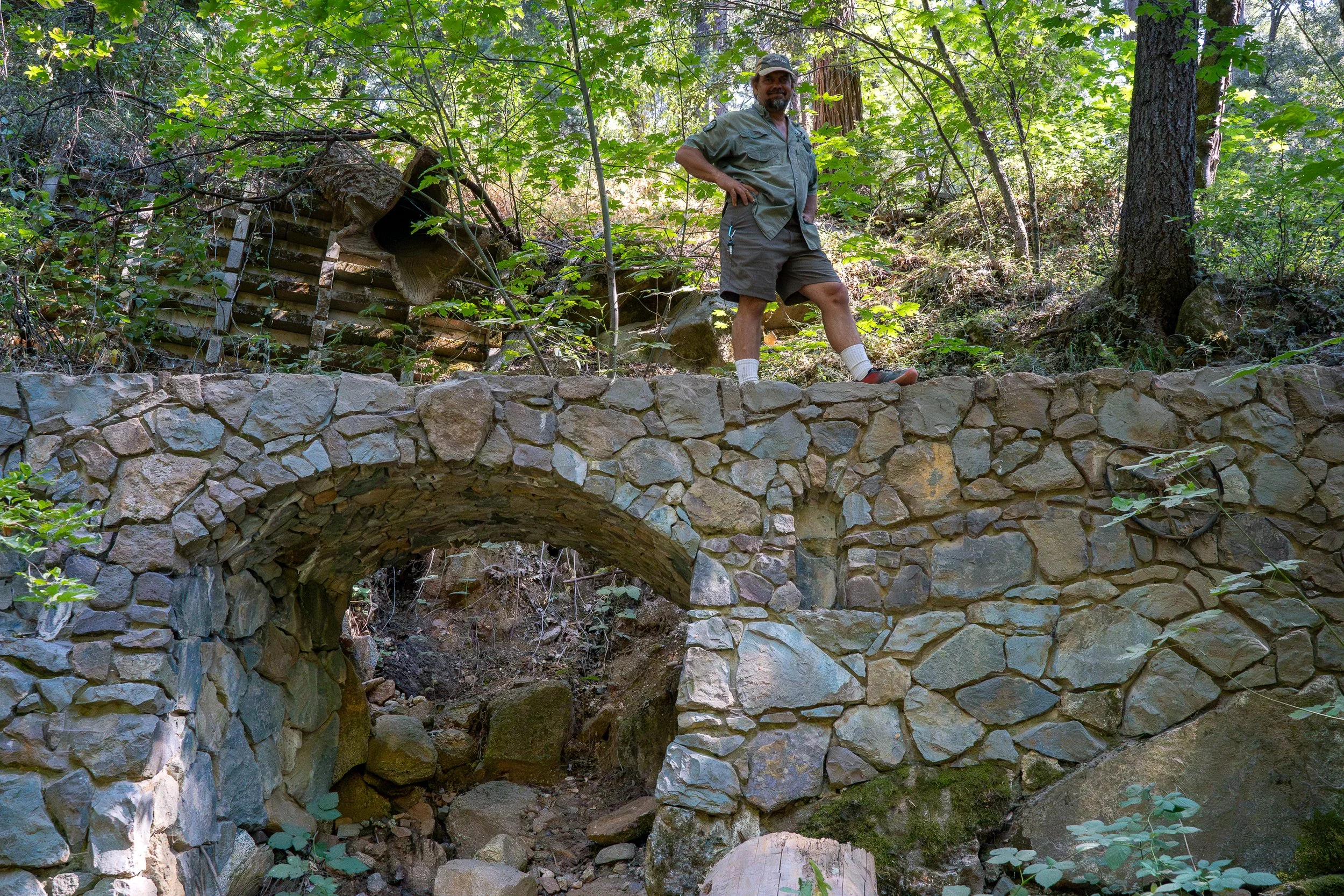 The culvert pipe could not be moved, so Zachi and his team disguised it as a fallen log using a technique called ferrocement faux bois.