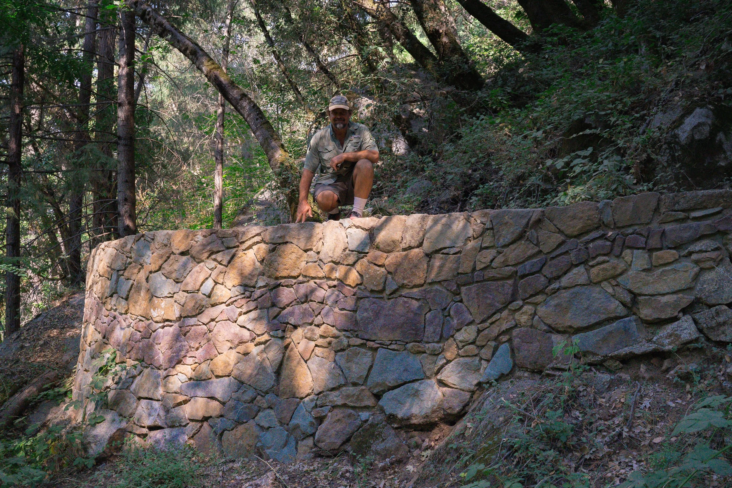 Wet stone retaining wall under construction on the Deer Creek Tribute Trail in 2014.